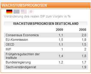 Im Handelsblatt finden wir ein Übersicht der aktuellen Prognosen für Deutschland. Danach wird 2009 mit einem Wachstum des realen Bruttoinlandsproduktes zwischen 1 und 1,5% gerechnet.