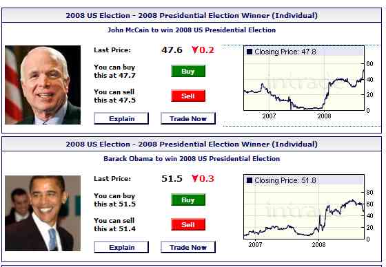 Vor einer Woche hatte sich John McCain erstmals vor Barack Obama im Erwartungshandel der Vorhersagebörse Intrade gesetzt. Am Ende dieser Woche haben sich die Erwartungen wieder gedreht. Obama liegt aktuell mit einer Wahrscheinlichkeit von 51,5% vor McCain, den die Händler bei Intrade nur noch mit einer Wahrscheinlichkeit von 47,6% vorn sehen.