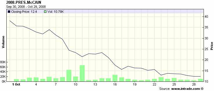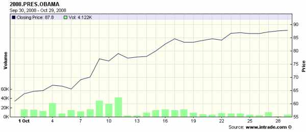 Geht es nach den Handelsteilsnehmern der Vorhersagebörse Intrade, dann ist die Präsidentschaftswahl in den USA bereits entschieden. Die Chancen für John McCain werden auf nur noch 13,8% eingeschätzt. Umgekehrt liegt Barack Obama bei 87,8%.