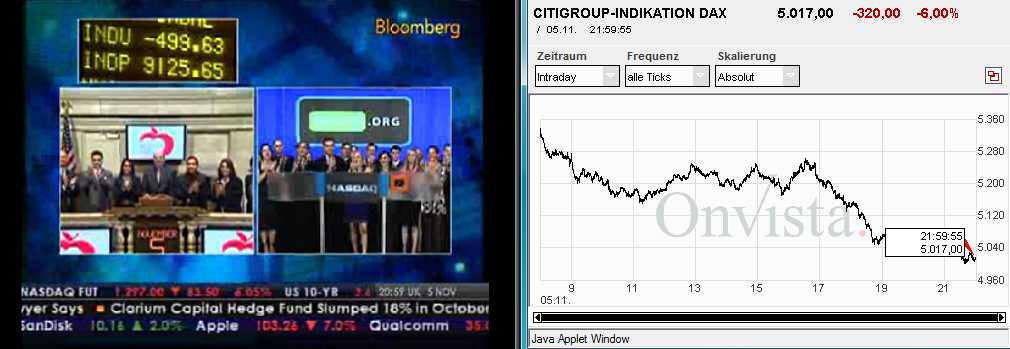 Die Obama-Party hatten die Börsen bereits gestern gefeiert. Heute hat sie zunächst der Kater eingeholt. Dass auch Obama trotz hoher Erwartungen leider auch nicht zaubern kann, dürfte klar sein. Ärgerlich an der heutigen Abwärtsbewegung ist, dass es wieder einmal diese berüchtigten last-hour-volatility gegeben hat. Die hatte ich eigentlich mit dem Oktober zu den Akten gelegt. Schade.
