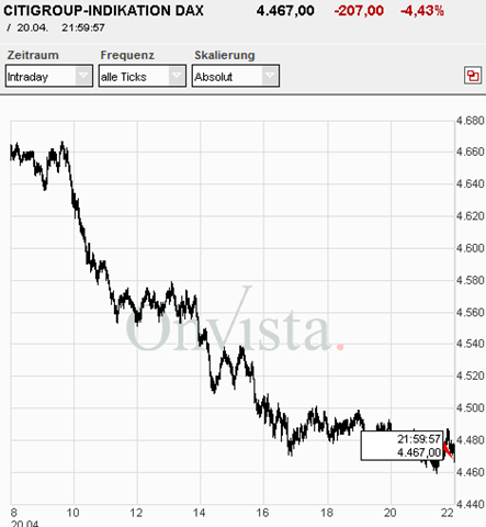Ein Grund für die angebliche Nervosität an der Börse soll angeblich ein Blogeintrag gewesen sein. Ein US-Blog, den ich nicht kenne und der auch wenig glaubwürdig erscheint, soll gemeldet haben, dass als ein Ergebnis des US-Stresstests der Banken die Mehrheit der Kreditinstitute insolvent sein müsste. Das dürfte sich allerdings schnell als Blog-PR-Ente entpuppen.