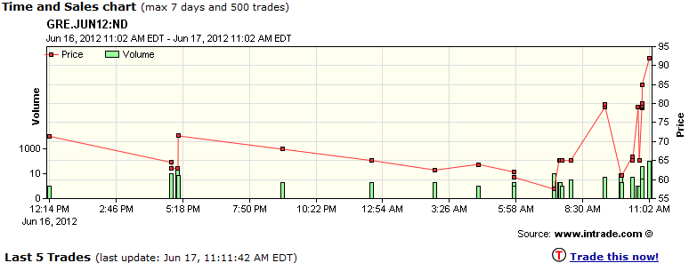 Ein letzter Blick auf die Vorhersagemärkte von Intrade. Dort sind in den letzten Stunden die Anteile: New Democracy to win auf 92% gestiegen und die von Syriza auf 15% gefallen. Der Chart sieht fasst so aus, als ob da Insider am Werk sind bzw. erste Umfrageergebnisse schon durchgesickert sind.