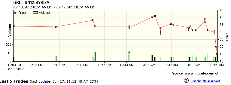 “Griechische Überlebenskünstler” schreibt FAZ Online und ergänzt “Die Griechen haben den Euro-Austritt abgewendet.” Solche Posts habe ich gestern Abend schon auf Twitter gesehen. Mal schauen, ob diese Sensation Auswirkungen auf das Wahlverhalten hat und Griechenland nun eher die riskantere Wahl trifft mit Syriza. Die Vorhersagemärkte auf Intrade sehen das allerdings nicht. Dennoch wird Syriza wieder etwas höher gehandelt also noch am Donnerstag. 34% beträgt jetzt die Erwartung, dass die Linken als stärkste Partei aus der Wahl hervor gehen.