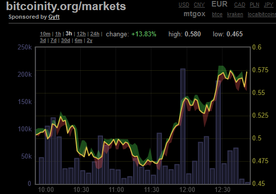 Wie man daraus sieht, sind die Spannen (= Differenzen zwischen Bid und Ask-Spalte) in Abhängigkeit vom Marktplatz relativ groß. Konkret bedeutet etwa die Spanne bei Mt. Gox, dass zum Zeitpunkt der Anzeige ein Käufer für einen Bitcoin (bzw. Bruchteilen, wie wir gleich sehen werden) 482,78 Euro zahlen müsste und einer Verkäufer 476 Euro erhalten würde.