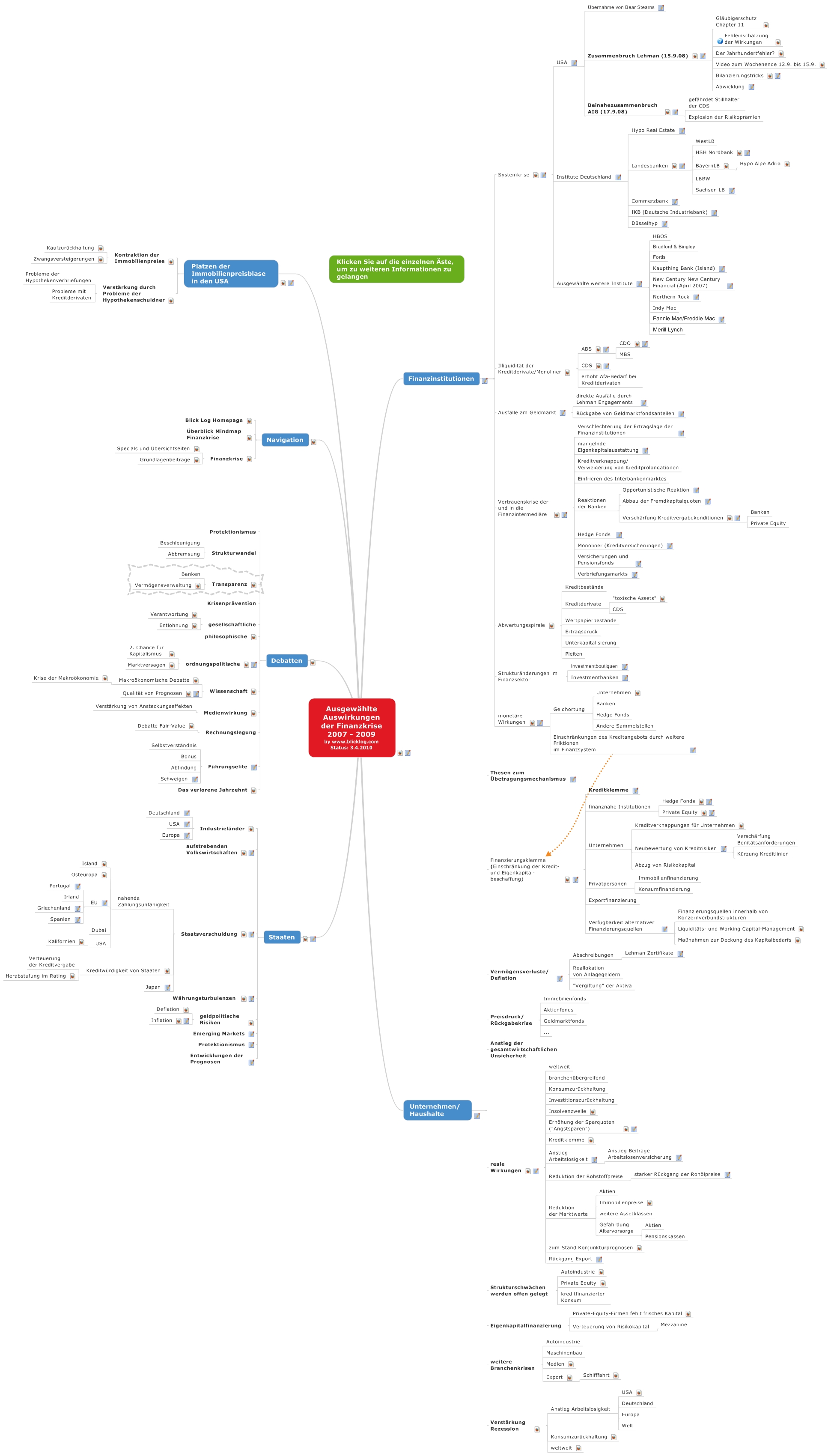 Finanzinstitutionen Systemkrise USA Übernahme von Bear Stearns Zusammenbruch Lehman (15.9.08) http://blog.rebeltraders.net/wp-content/uploads/2008/09/show-case-doc.pdf http://www.blicklog.com/2008/11/13/wirtschaftsweise-zur-fehleinschatzung-der-us-behorden-im-fall-von-lehman-brothers/ http://wissen.spiegel.de/wissen/dokument/dokument.html?id=64497194&top=SPIEGEL http://www.zdf.de/ZDFmediathek/beitrag/video/838036/Crash---Die-Pleite-der-Lehman-Bank Bilanzierungstricks Abwicklung Beinahezusammenbruch AIG (17.9.08) gefährdet Stillhalter der CDS Explosion der Risikoprämien Institute Deutschland Hypo Real Estate Landesbanken WestLB HSH Nordbank BayernLB http://www.br-online.de/bayerisches-fernsehen/geld-und-leben-das-wirtschaftsmagazin/landesbank-wirtschaftsmagazin-wirtschaft-bayernlb-hypo-alpe-ID1265033544203.xml LBBW Sachsen LB Commerzbank IKB (Deutsche Industriebank) Düsselhyp Ausgewählte weitere Institute HBOS Bradford & Bingley Fortis Kaupthing Bank (Island) New Century New Century Financial (April 2007) Northern Rock Indy Mac Fannie Mae/Freddie Mac Merill Lynch Illiquidität der Kreditderivate/Monoliner ABS CDO MBS CDS erhöht Afa-Bedarf bei Kreditderivaten Ausfälle am Geldmarkt direkte Ausfälle durch Lehman Engagements Rückgabe von Geldmarktfondsanteilen Vertrauenskrise der und in die Finanzintermediäre Verschlechterung der Ertragslage der Finanzinstitutionen mangelnde Eigenkapitalausstattung Kreditverknappung/ Verweigerung von Kreditprolongationen Einfrieren des Interbankenmarktes Reaktionen der Banken Opportunistische Reaktion Abbau der Fremdkapitalquoten Verschärfung Kreditvergabekonditionen Banken Private Equity Hedge Fonds Monoliner (Kreditversicherungen) Versicherungen und Pensionsfonds Verbriefungsmarkts Abwertungsspirale Kreditbestände Kreditderivate http://www.blicklog.com/finanzkrise/toxische-wertpapiere/ CDS Wertpapierbestände Ertragsdruck Unterkapitalisierung Pleiten Strukturänderungen im Finanzsektor Investmentboutiquen Investmentbanken monetäre Wirkungen Geldhortung http://www.ftd.de/karriere_management/management/:Krisenstrategie-Der-Domino-Effekt/474074.html Banken Hedge Fonds Andere Sammelstellen Einschränkungen des Kreditangebots durch weitere Friktionen im Finanzsystem Unternehmen/ Haushalte Thesen zum Übetragungsmechanismus Finanzierungsklemme (Einschränkung der Kredit- und Eigenkapital- beschaffung) Kreditklemme finanznahe Institutionen Hedge Fonds Private Equity Unternehmen http://www.blicklog.com/tags/kreditklemme/ Neubewertung von Kreditrisiken Verschärfung Bonitätsanforderungen Kürzung Kreditlinien Abzug von Risikokapital Privatpersonen Immobilienfinanzierung Konsumfinanzierung Exportfinanzierung Verfügbarkeit alternativer Finanzierungsquellen Finanzierungsquellen innerhalb von Konzernverbundstrukturen http://www.de-wirtschaftsberatung.de/wp-content/krisenmanagement/liquiditaet/map.htm http://www.de-wirtschaftsberatung.de/wp-content/krisenmanagement/kapitalbedarf/map.htm Vermögensverluste/ Deflation Abschreibungen Lehman Zertifikate Reallokation von Anlagegeldern "Vergiftung" der Aktiva Preisdruck/ Rückgabekrise Immobilienfonds Aktienfonds Geldmarktfonds ... Anstieg der gesamtwirtschaftlichen Unsicherheit reale Wirkungen weltweit branchenübergreifend Konsumzurückhaltung Investitionszurückhaltung http://www.faz.net/s/RubD16E1F55D21144C4AE3F9DDF52B6E1D9/Doc~EDC1575E46A0A48C3A8EB9EEDF2502218~ATpl~Ecommon~Scontent.html Erhöhung der Sparquoten ("Angstsparen") http://www.faz.net/s/Rub58241E4DF1B149538ABC24D0E82A6266/Doc~E394F25968283422B91860F1DBF152208~ATpl~Ecommon~Scontent.html Anstieg Arbeitslosigkeit Anstieg Beiträge Arbeitslosenversicherung Reduktion der Rohstoffpreise starker Rückgang der Rohölpreise Reduktion der Marktwerte Aktien http://ftalphaville.ft.com/blog/2009/03/06/53269/property-prices-fall-across-europe/ weitere Assetklassen Gefährdung Altervorsorge Aktien Pensionskassen http://www.blicklog.com/finanzkrise/prognosen/ Rückgang Export Strukturschwächen werden offen gelegt http://www.blicklog.com/2009/02/19/staatshilfe-fr-vw-bank-alle-denken-an-die-autos-niemand-an-den-mittelstand/ http://www.handelsblatt.com/unternehmen/banken-versicherungen/private-equity-das-ende-einer-goldenen-aera;2114895 kreditfinanzierter Konsum Eigenkapitalfinanzierung http://www.handelsblatt.com/unternehmen/banken-versicherungen/finanzstars-im-ueberlebenskampf;2136706 Verteuerung von Risikokapital Mezzanine weitere Branchenkrisen Autoindustrie Maschinenbau http://www.spiegel.de/netzwelt/web/0,1518,607889,00.html Export http://www.handelsblatt.com/unternehmen/handel-dienstleister/maersks-duestere-prognose-fuer-die-schifffahrt;2189536 Verstärkung Rezession Anstieg Arbeitslosigkeit http://www.handelsblatt.com/politik/konjunktur-nachrichten/us-jobmarkt-erreicht-stadium-der-panik;2191513 Deutschland Europa Welt http://www.nytimes.com/2009/03/06/business/economy/06retail.html?hp http://www.handelsblatt.com/politik/konjunktur-nachrichten/welthandel-steuert-auf-mega-einbruch-zu;2195659 Staaten Industrieländer Deutschland USA Europa aufstrebenden Volkswirtschaften Staatsverschuldung nahende Zahlungsunfähigkeit http://online.wsj.com/article/SB123032660060735767.html http://www.voxeu.org/index.php?q=node/3467 EU Portugal Irland Griechenland Spanien Dubai USA http://www.nzz.ch/nachrichten/wirtschaft/aktuell/kalifornien_vor_einem_liquiditaetsengpass_1.2618063.html Kreditwürdigkeit von Staaten Verteuerung der Kreditvergabe http://www.ftd.de/boersen_maerkte/aktien/anleihen_devisen/517107.html Japan Währungsturbulenzen geldpolitische Risiken http://www.readers-edition.de/2008/11/27/von-der-inflation-zur-deflation Inflation Emerging Markets Protektionismus Entwicklungen der Prognosen Debatten Protektionismus Strukturwandel Beschleunigung Abbremsung Transparenz Banken http://www.blicklog.com/2009/02/18/die-provisionsschneiderei-der-vermogensverwaltungen-und-versicherungen-am-fall-madoff/ Krisenprävention gesellschaftliche http://www.handelsblatt.com/unterne